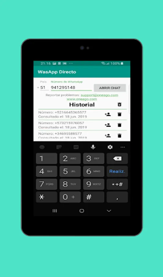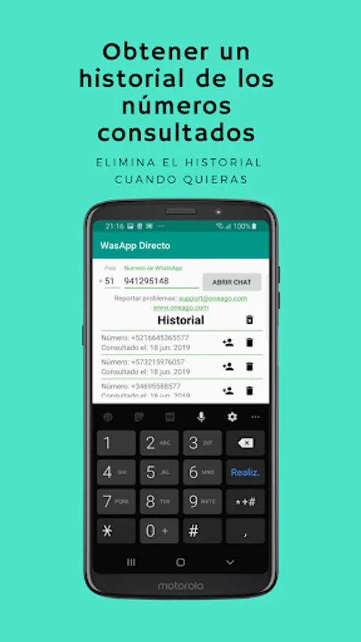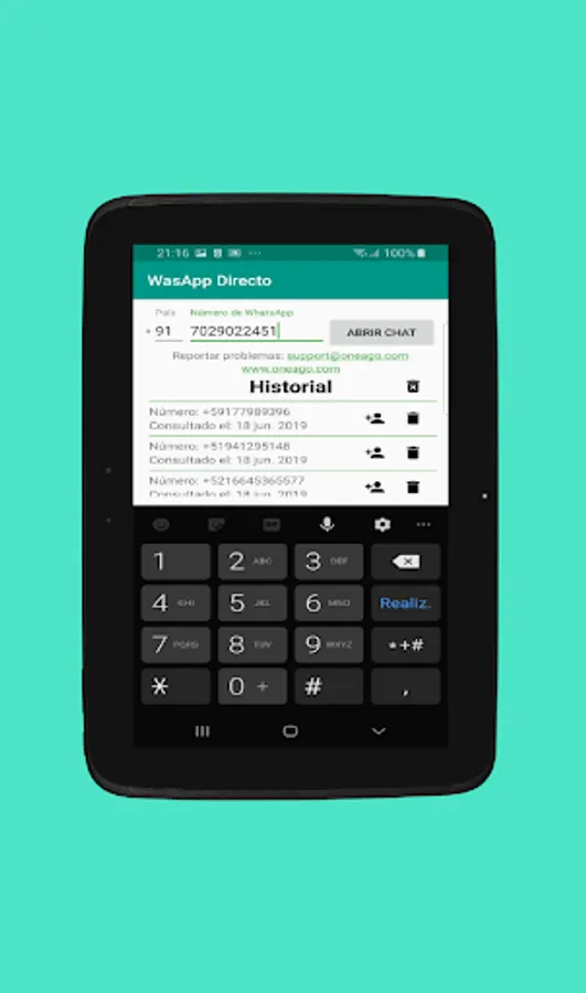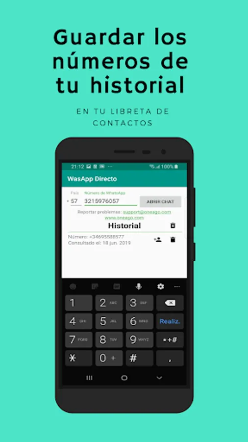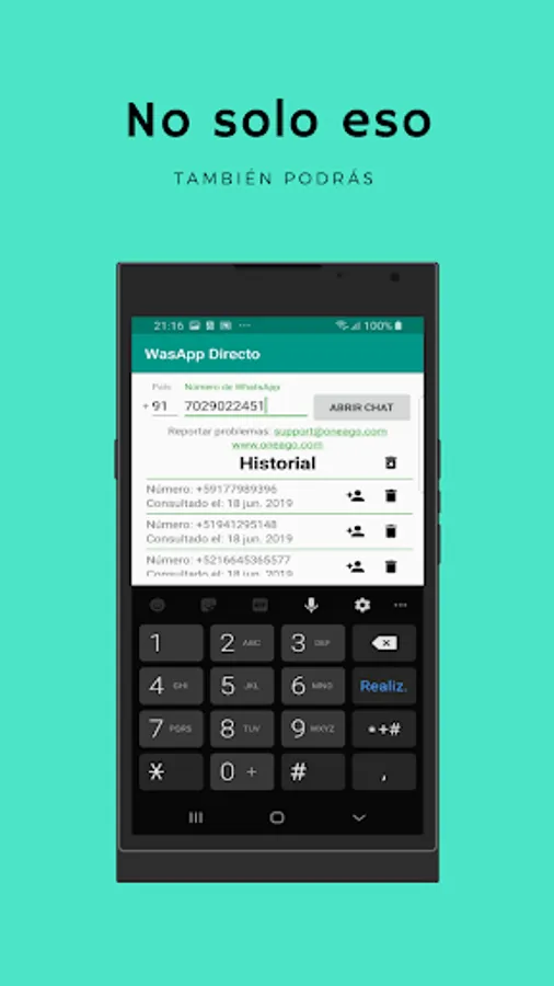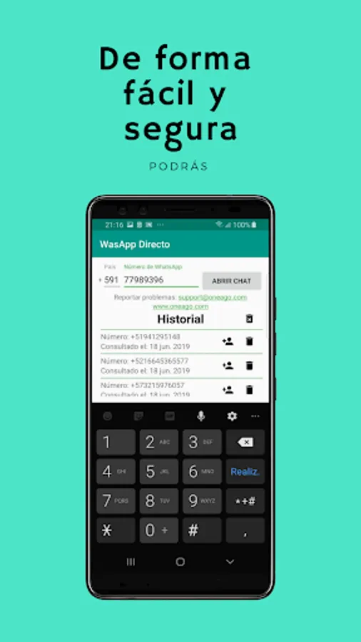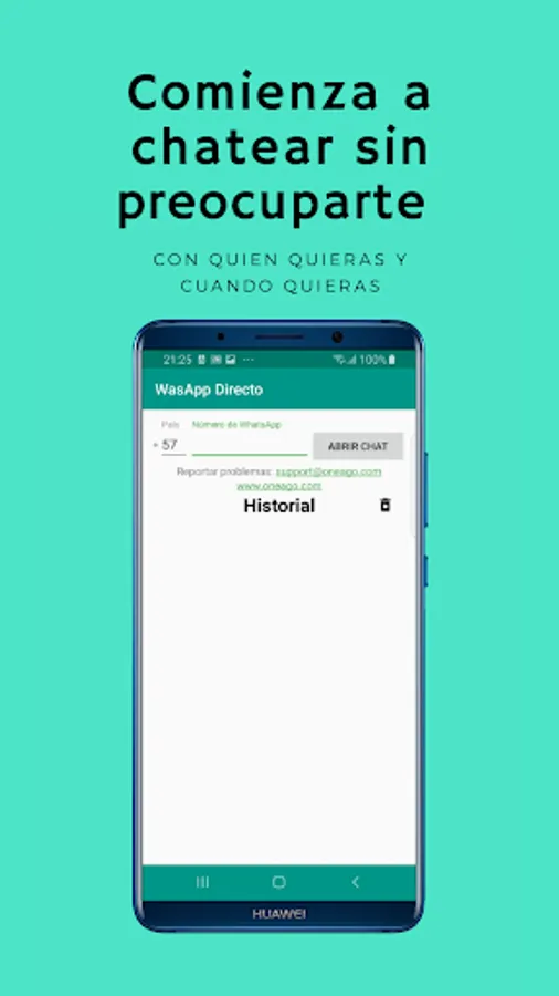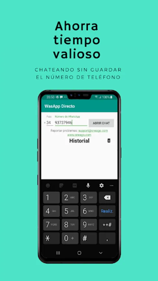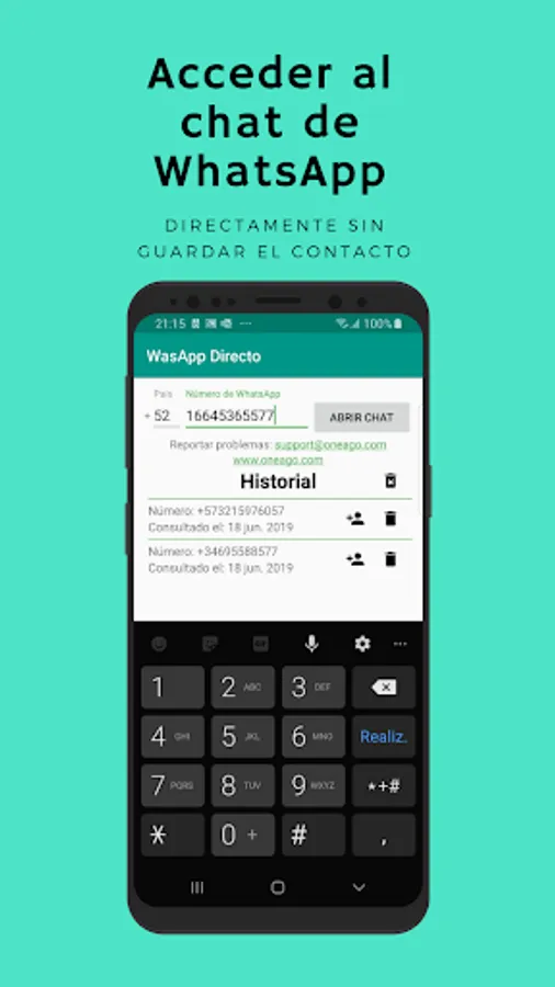Do you want to access your WhatsApp chat without saving the contact? Oneago has developed an easy and simple to use application, which allows you to chat with any person on WhatsApp, even if you do not have it stored in your contact list. You only have to select the country in which the person is, enter the cell number and you are ready, you can access to chat with the person without the need to add it to your contact list.
