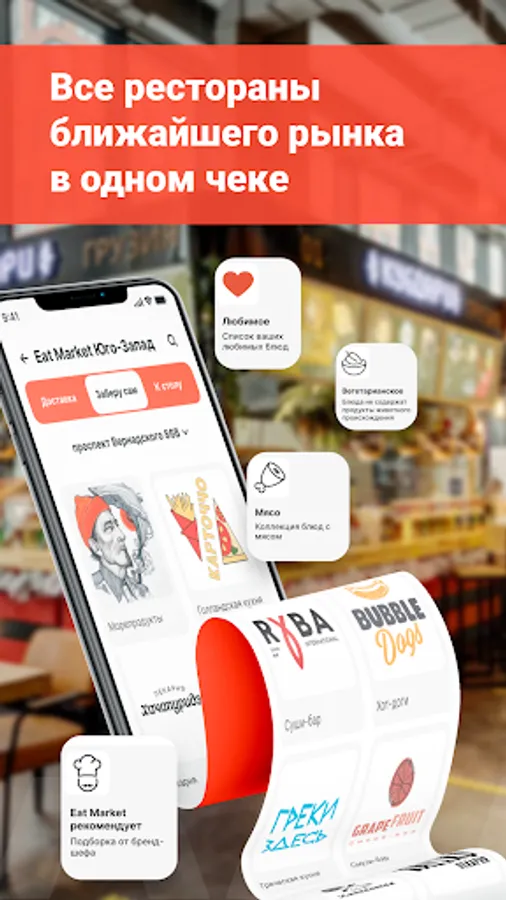 Eat Market is a delivery service for delicious, hot and affordable food from the food halls of the same name, combining dozens of culinary concepts.