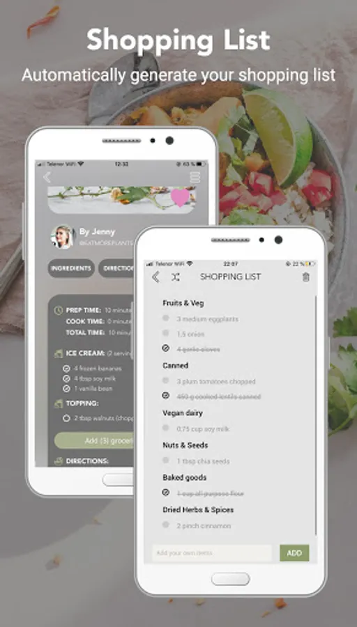 To make shopping as easy as possible, every ingredient you select in a recipe can be added to an automatically generated shopping list. You can also shuffle the list to categorize all your ingredients by where they are located in the grocery store or by recipe. You can also add your own items to the shopping list, be it a toothbrush or a cactus.