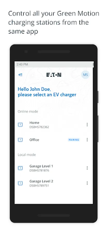 With the Eaton Green Motion Charger controller mobile app, you can remotely control your Eaton Green Motion charging station(s) from your phone. Depending on your installation, you will connect locally (your charging station is not connected to the internet and you will need to be in range to control it) or online (your charging station is connected to the internet). We strongly recommend the online mode, so you can access all features.