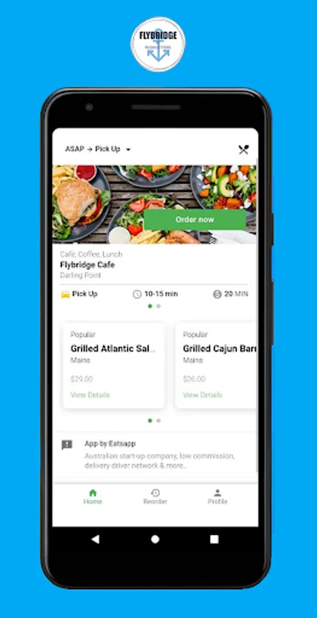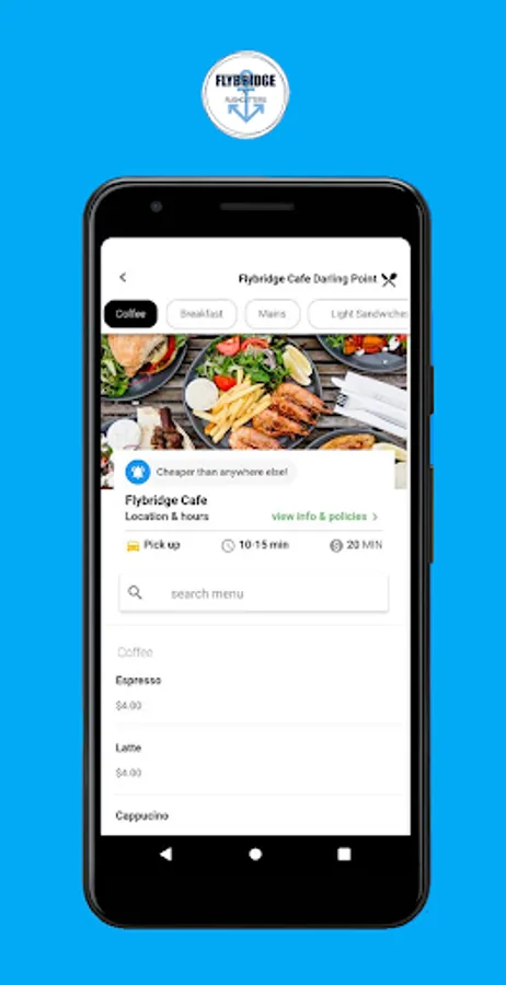 Pre-order your food and drinks with our Flybridge Cafe App and pay using Cash, Loyalty or Credit Card.