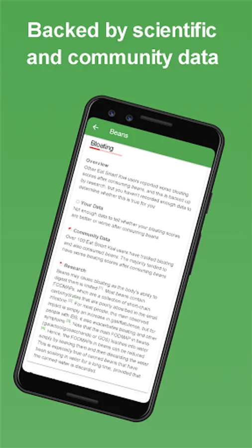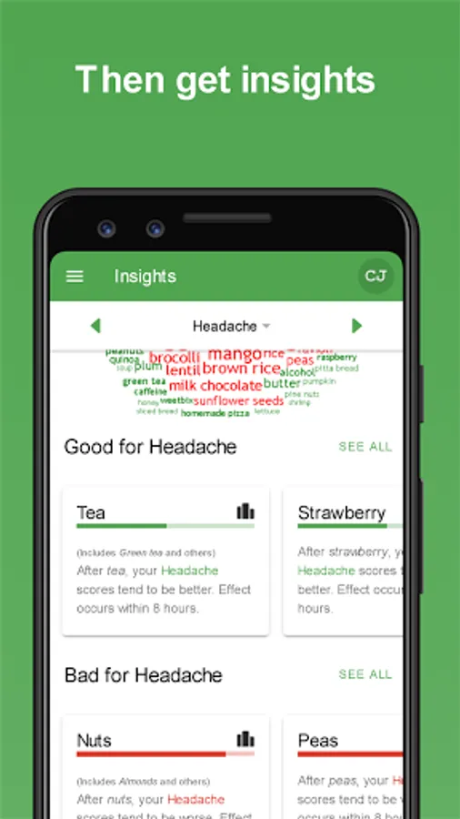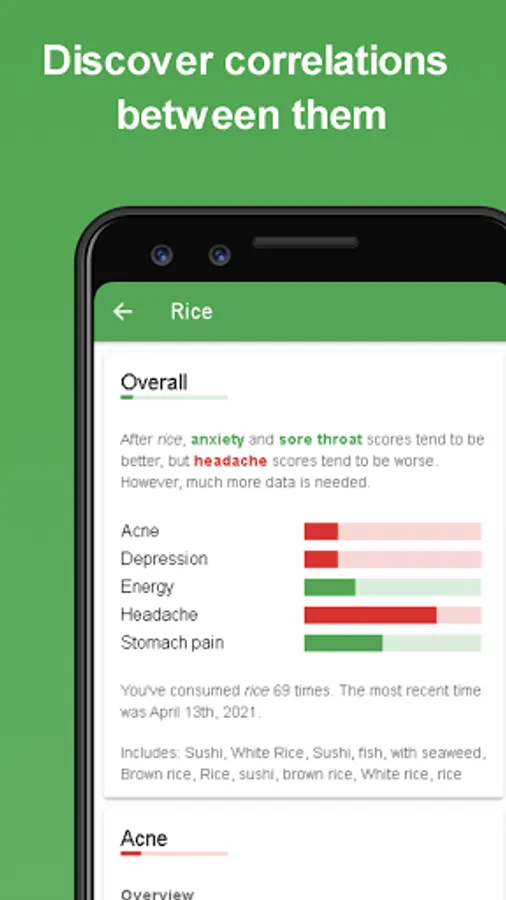 After keeping a food and health diary, you'll get insights on what foods make your conditions worse, and what foods make them better, as well as the strength and significance of the correlation, whether others have experienced the same thing, and whether any scientific studies have been done on that particular food and condition.