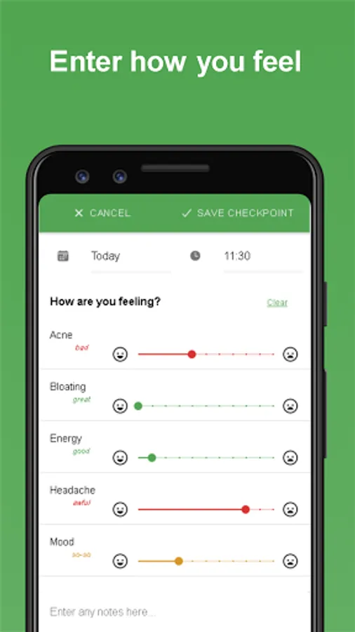 Eat Smart Kiwi helps you discover the effect of your eating on acne, bloating, stomach pain, headaches, energy levels, mood, or anything else you want to track. Every day, you record what you eat and how you feel, and we figure out all the correlations between the two. This helps you discover your personal allergies or intolerances, or simply how your body reacts to different foods and drinks.