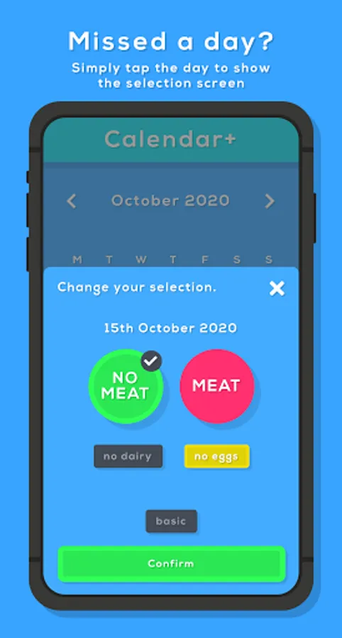 Use the app’s handy overview of the calendar to change previous dates accordingly. Your daily meals can be added within the app for detailed tracking of your meat and animal product consumption. Select the products and the amount to track and achieve your goals. Get notified and stay alerted of your achievements. Track and reduce the meat consumption and other animal products intake with this app.