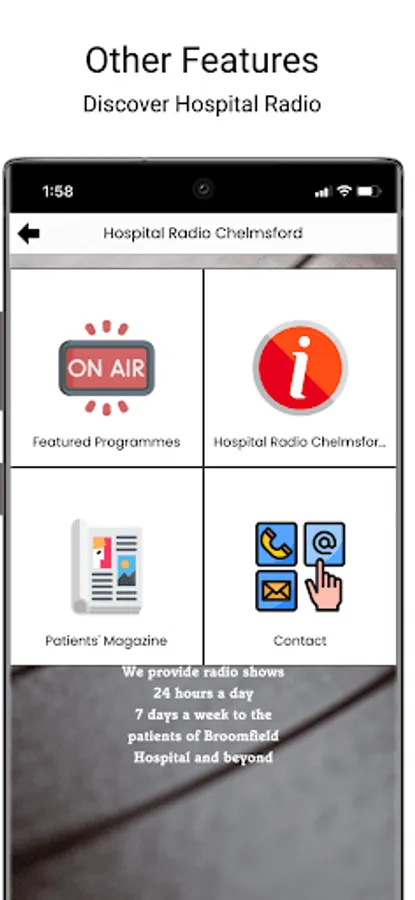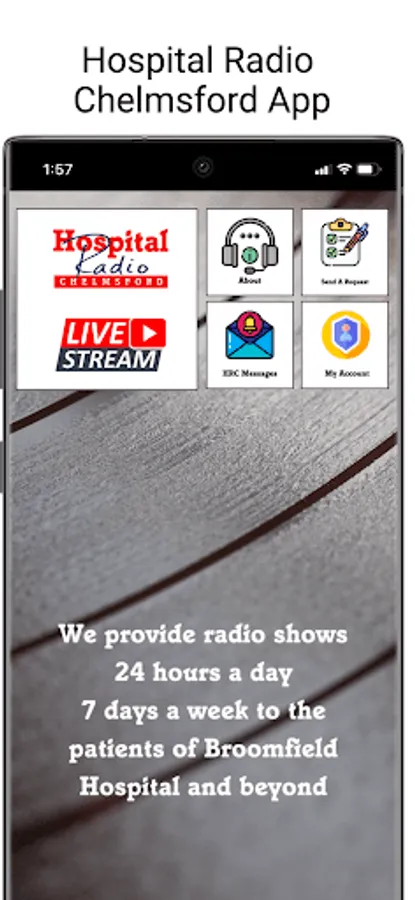 Hospital Radio Chelmsford was established in 1964, initially broadcasting from the Chelmsford and Essex Hospital and then subsequently for a number of years from the Gate Lodge at St. John's Hospital. We now broadcast from our studio complex at Broomfield Hospital. This comprises of two main studios and a third studio for production.