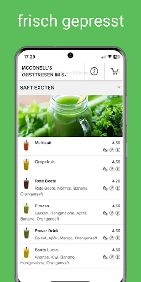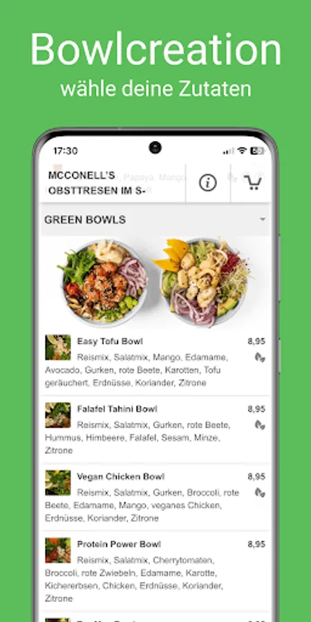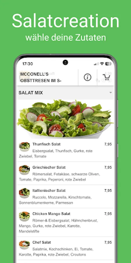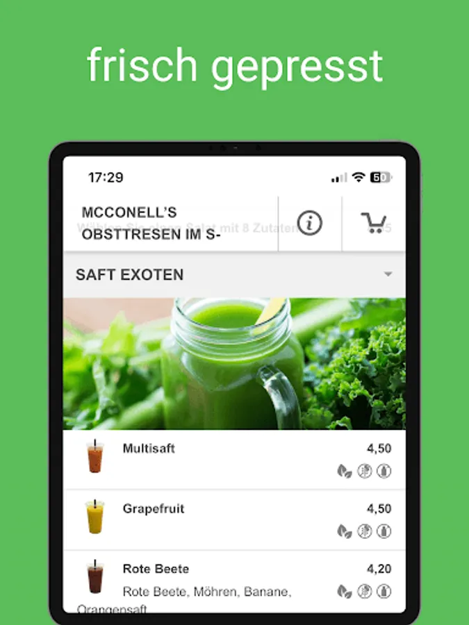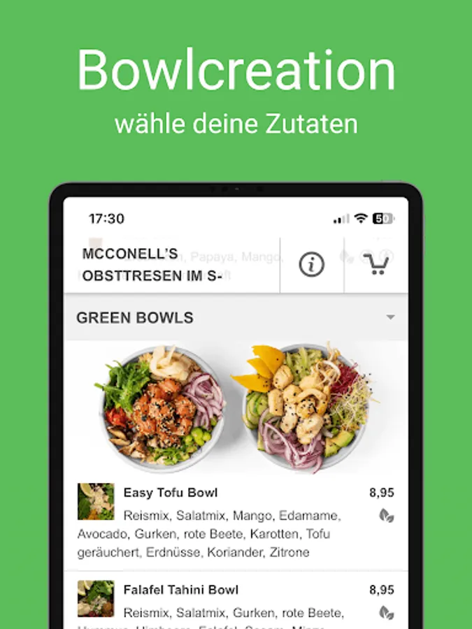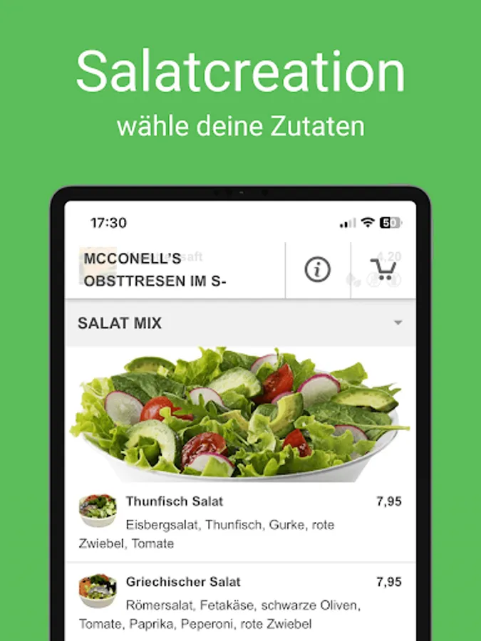 Let your imagination run wild and create your own salad mix from our wide range of over 60 ingredients. Choose from a wide variety of salads and vegetables, various other delicious ingredients and our tasty dressings. The salads are suitable both for a healthy snack in between meals and for a real, wholesome meal. McConell's Obsttresen also offers a large selection of fresh ingredients for vegetarians and vegans. Our employees will be happy to advise you on the composition. In just a few steps you can create a vitamin-rich salad according to your ideas and enjoy it straight away