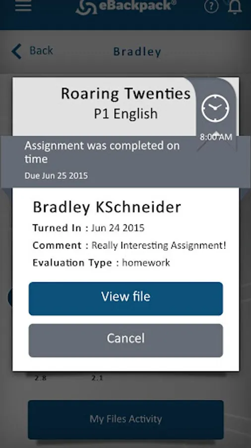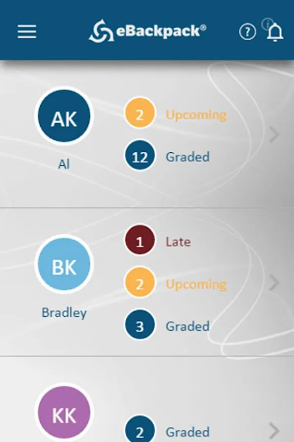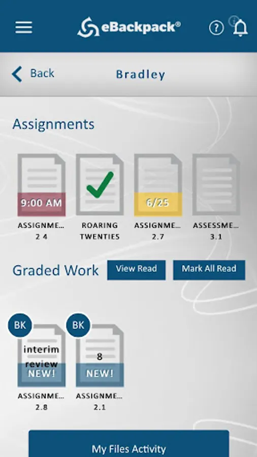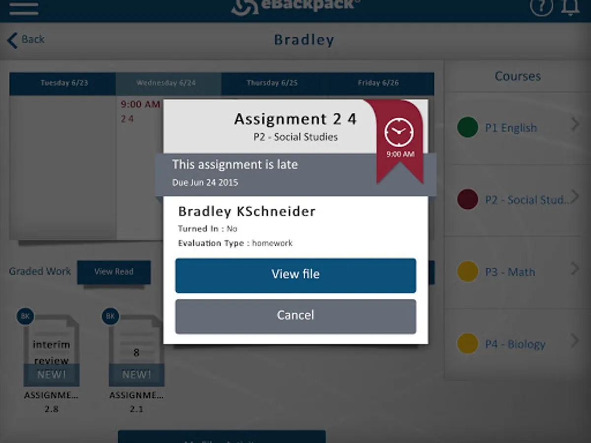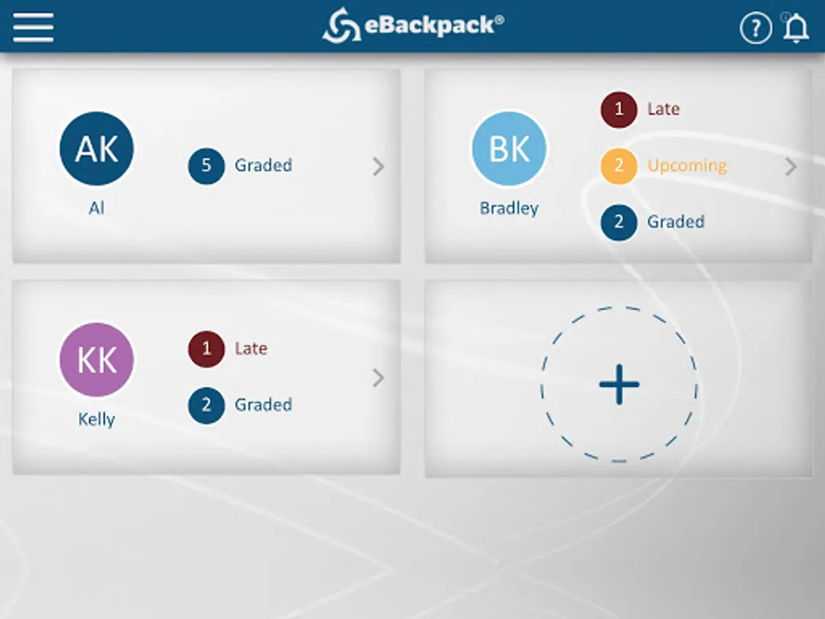 eBackpack for Parents provides easy access to your child's school work with push notifications* (premium feature) to alert you when an assignment is past due or a due soon, a new grade has been returned, and much more. This app allows you to see your child's upcoming assignments, what and when your students submitted something, and the returned reviews; all in real time, not weeks later.