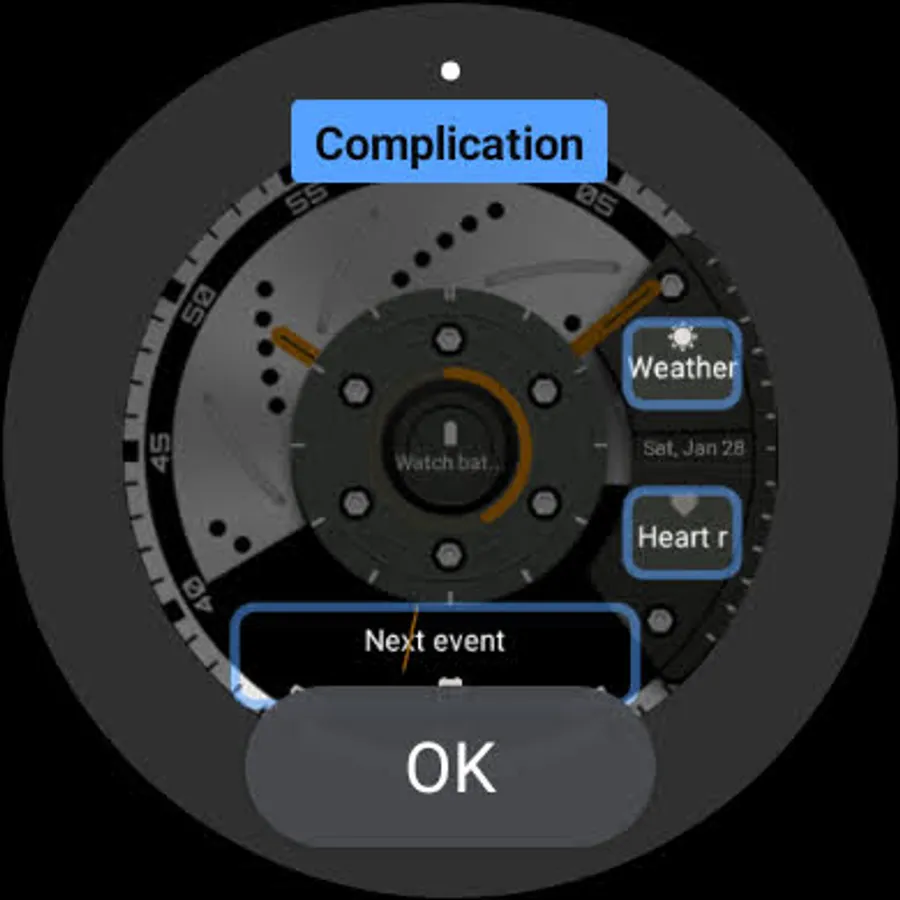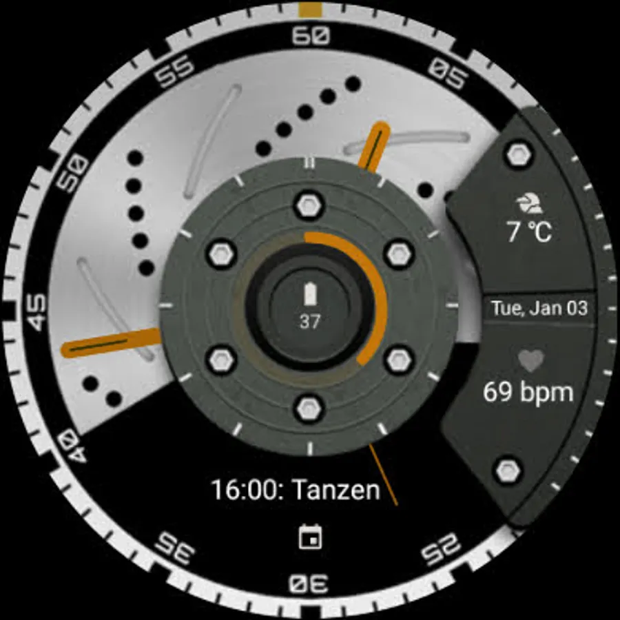 Stylish modern analog watch face that resembles metal components. It supports configurable indicators.