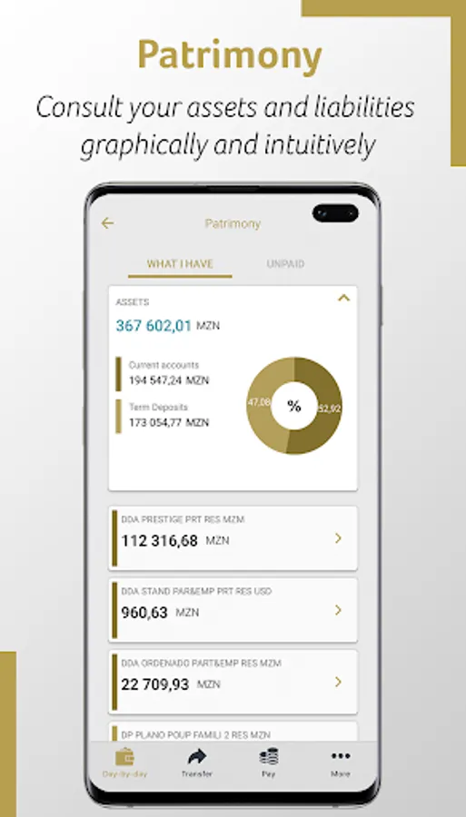 You will be able to view your assets and liabilities in a graphic and intuitive way, just by clicking on the Patrimony button right below the product carousel.