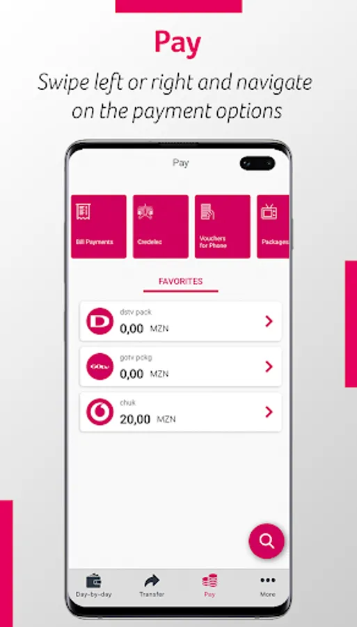 Whenever you want to pay for a service, just click on “Pay” on the navigation bar. Here you can make the following payments: