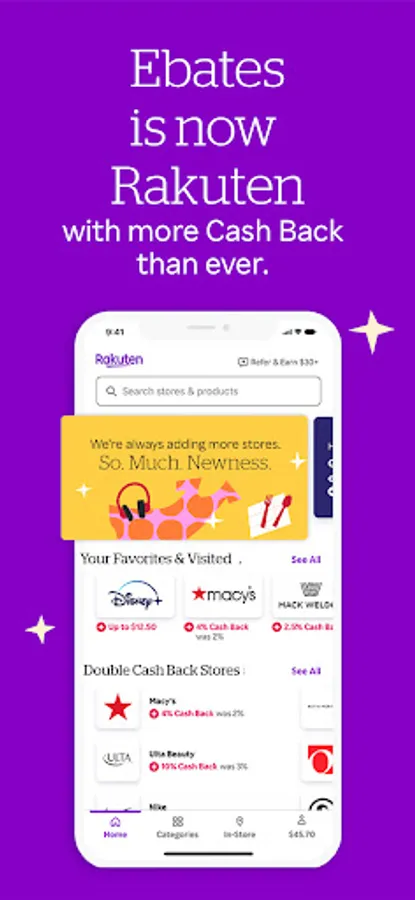 The Rakuten app is trusted by over 15 million members for a few reasons: You can shop & earn Cash Back either online or in-store at over 3,500 partners, directly on store sites! Cash Back can be stacked on top of sales, coupons, and other deals. When it’s time to get paid, you can choose either a Big Fat Check mailed directly to you or PayPal for instant Cha-Ching. With over $3.5 billion (that’s billion with a b) rewards earned so far, what are you waiting for?
