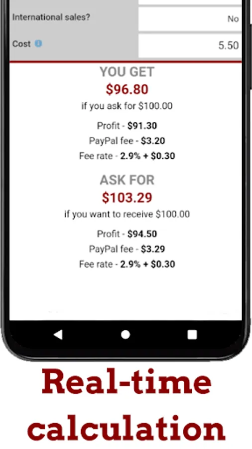 The PayPal calculator accurately calculates your profits from PayPal merchant fees. This free app breaks down the fees charged by PayPal and calculates your net profit based on the total payment amount, various costs and the type of PayPal's product.
