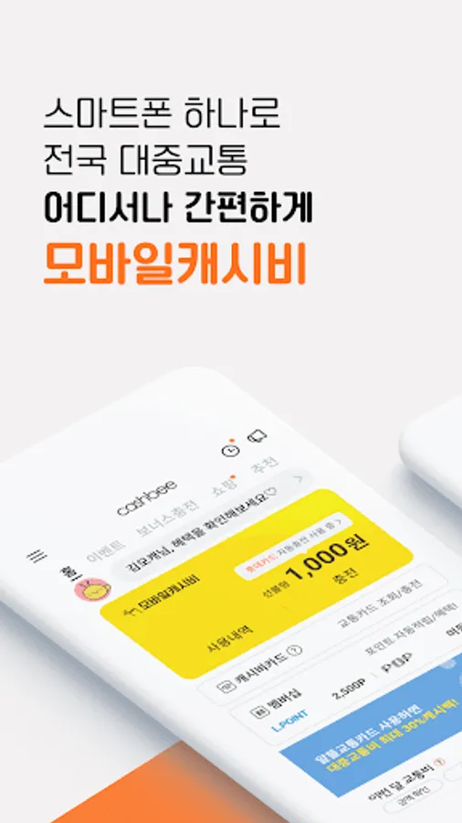 Mobile Cashbee is a mobile transportation card service that is more convenient than plastic transportation cards. You can use public transportation and distribution merchants nationwide with just a smartphone tag on your transportation and distribution terminal, and you can enjoy various services such as online charging and online merchant use.