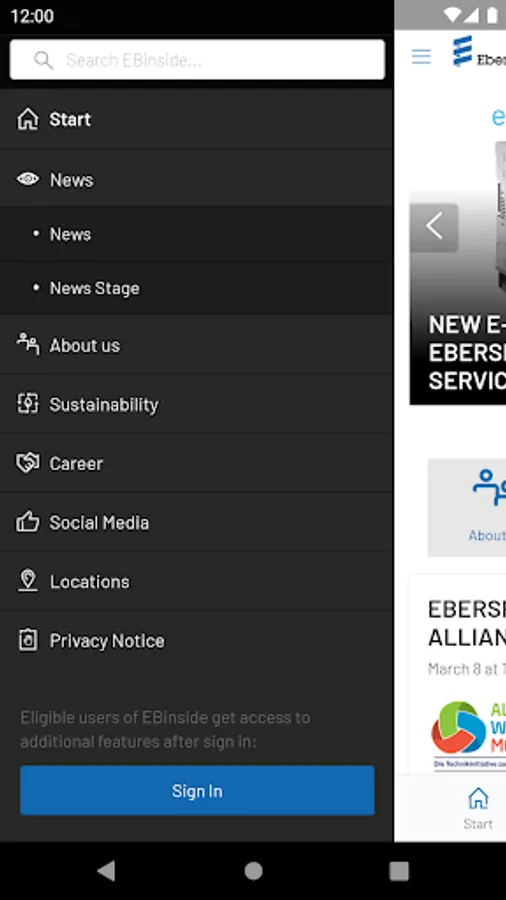 The EBinside app provides partners, employees, customers and applicants with up-to-date information about the Eberspächer Group. Thanks to the news feed, you receive regular updates from the company directly on your smartphone. In addition, the app gives you insights into our fields of innovation, corporate strategy, and a map of our approximately 80 locations worldwide. An overview of vacancies is also part of the app. Additional content and functions are available for registered users.