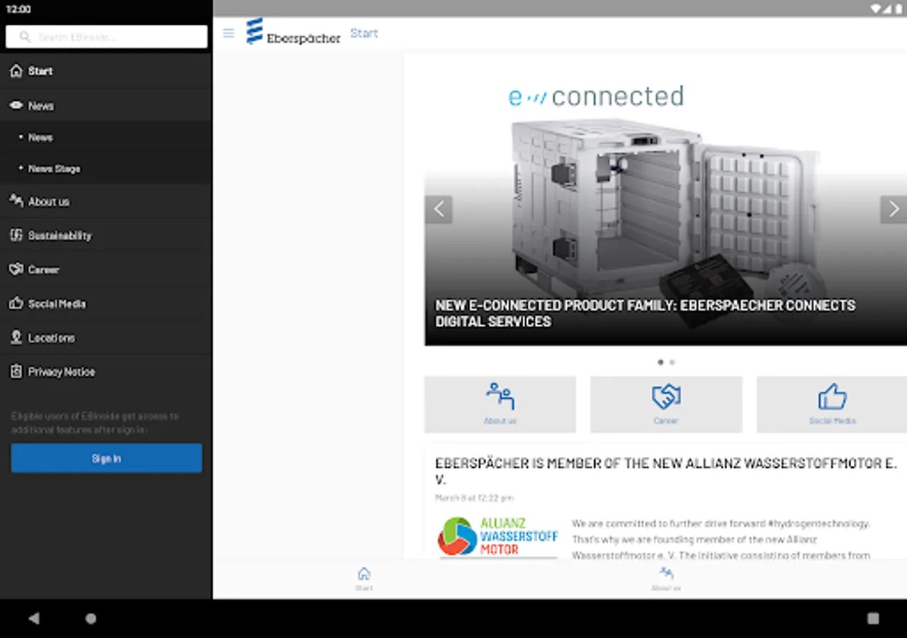 With EBinside, the Eberspächer Group is expanding its corporate communications by a mobile channel and is continuously developing it further. Download the app now and stay up-to-date!