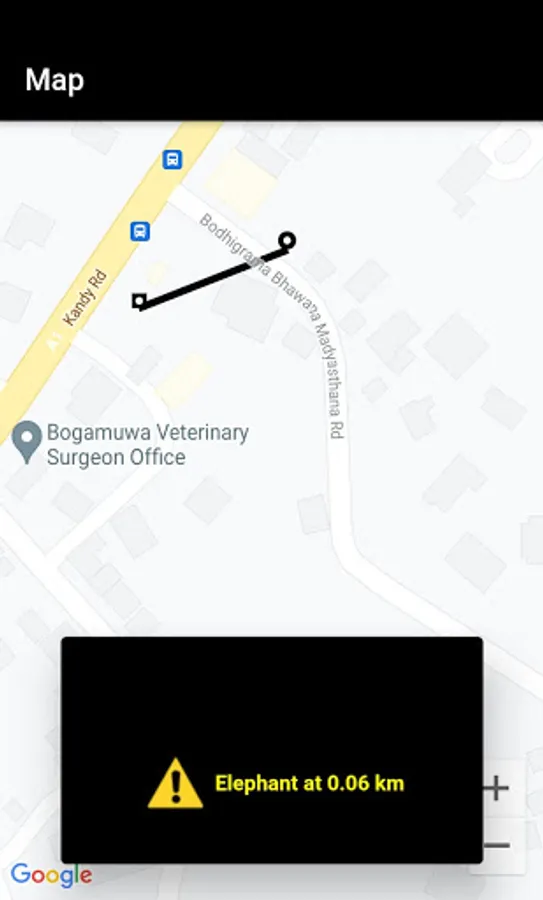 If a user is within 1km of an elephant, distance to the elephant from a user will be shown graphically and numerically in real-time.