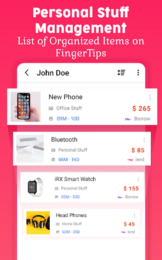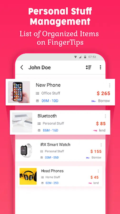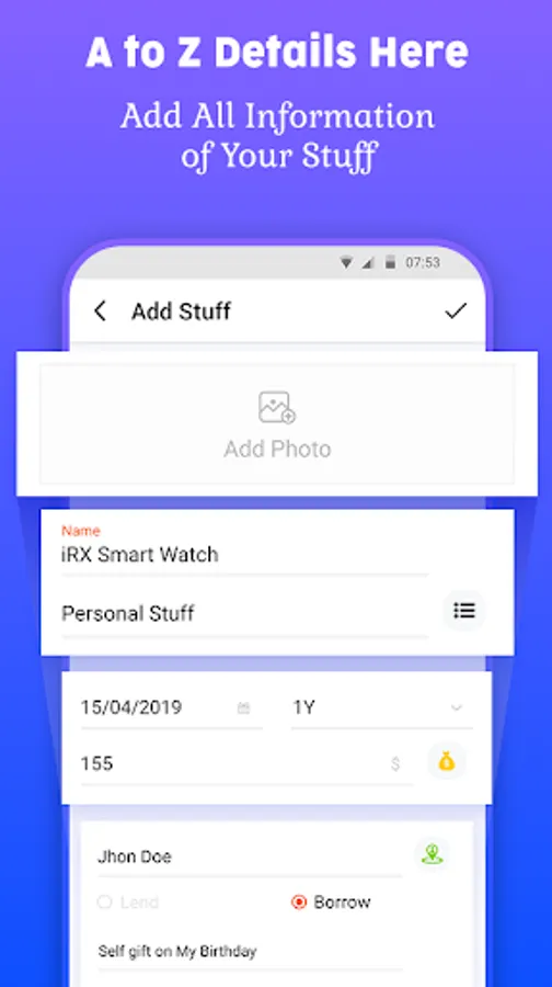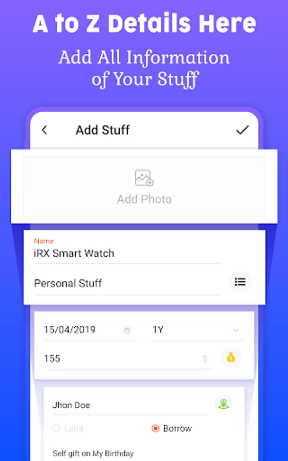 Shopping is a common hobby, but you also need to keep your hands tight! This anytime organizer App(inventory app) will help you to keep an eye on all your favorite things from whom you have Lend/Borrow stuff!