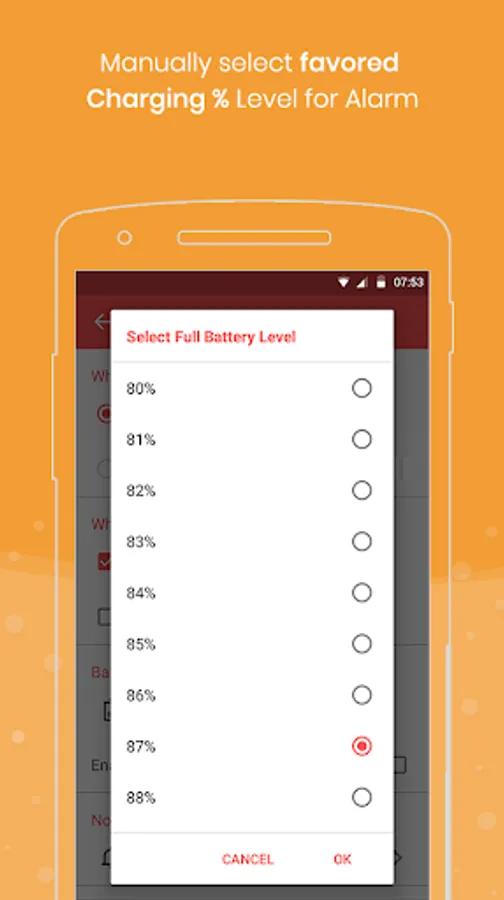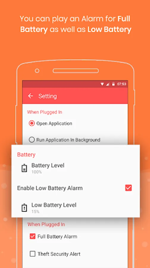 Set low battery or battery full alert alarm Sound with your favorite ringtone.