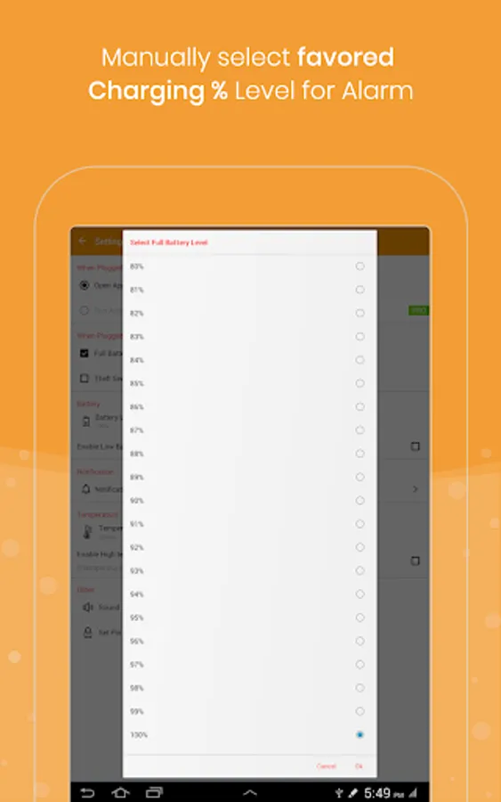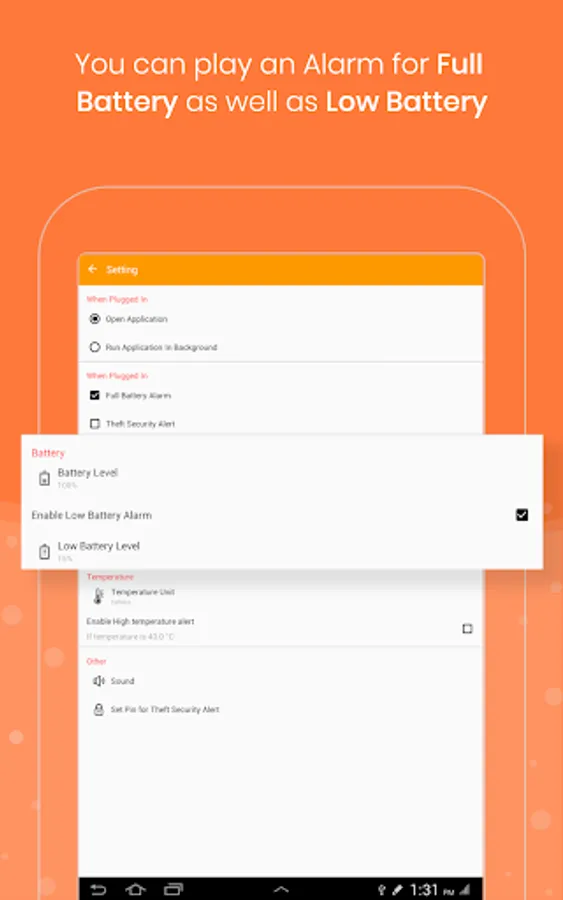 Enable battery notification to get notification about battery percentage level and battery temperature alert.