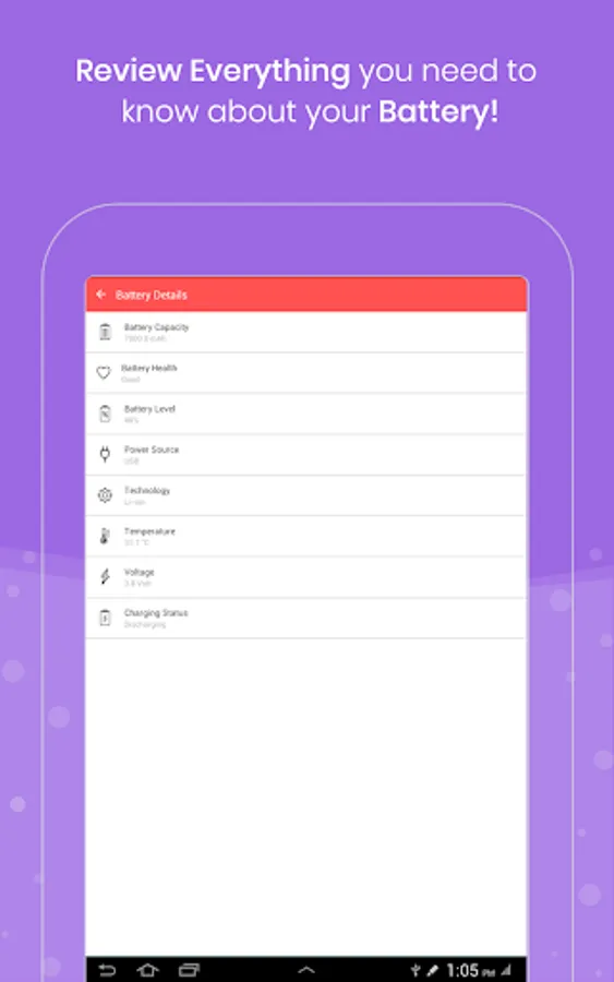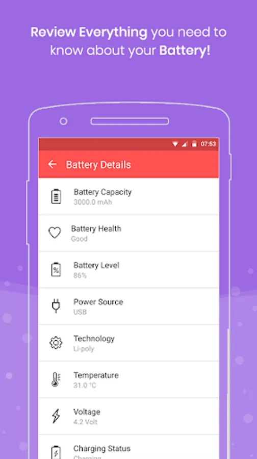 Mobile temperature level, Battery Capacity, Battery Health, Battery level, Power Source, Technology, Voltage and, Charging Status.