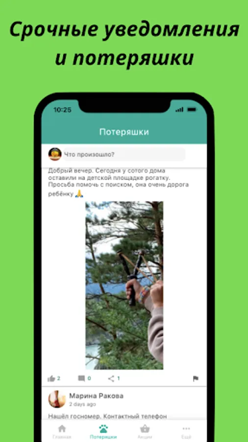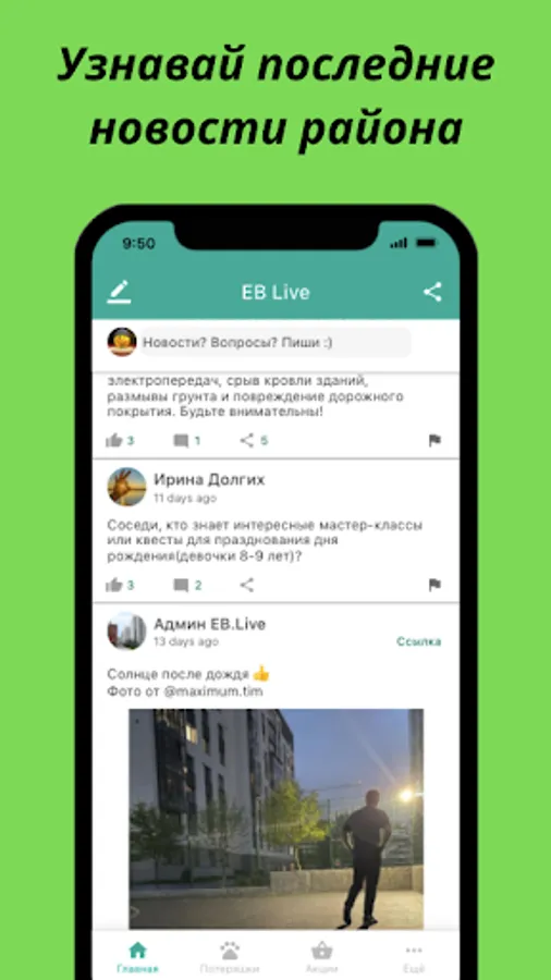 Here you can find out about the news of the microdistrict, events, incidents, discounts and promotions nearby, ask a question or give a recommendation to neighbors, as well as unite by interests.