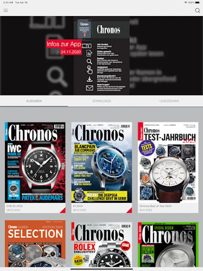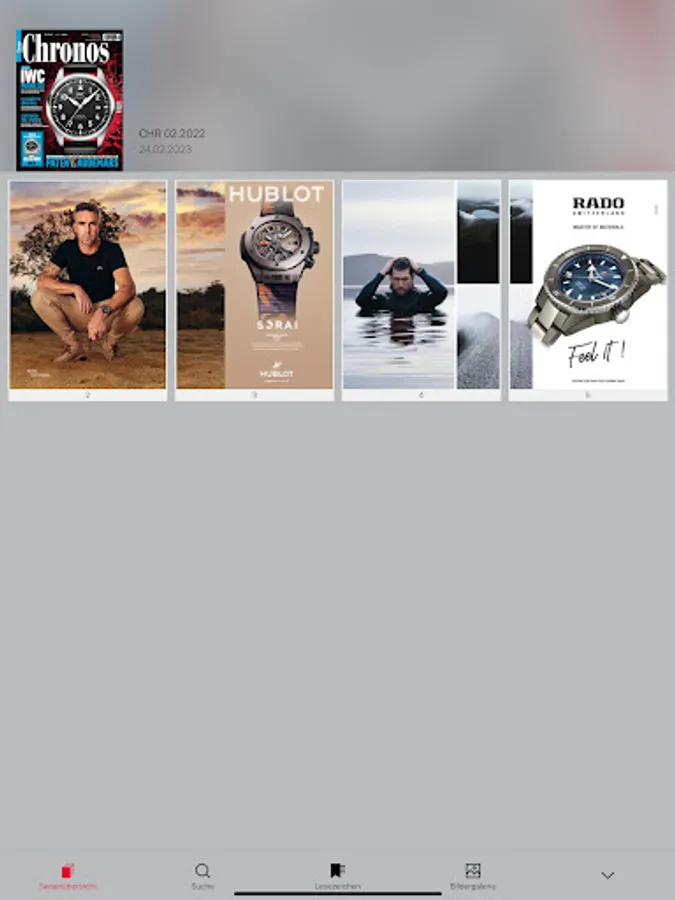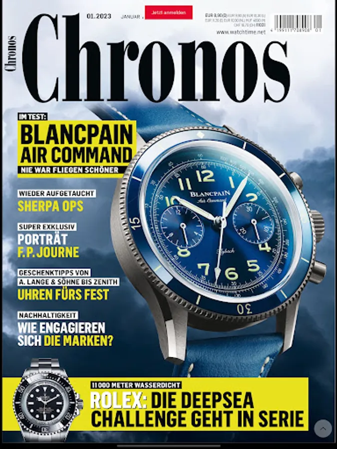 The special-interest magazine CHRONOS reports every two months from the world of high-quality wristwatches. CHRONOS writes for readers and buyers with a sense of technical quality, design, brand worlds and luxury. As the clear market leader in circulation among watch magazines, CHRONOS has been the clear number 1 in the popularity of readers for years. The aim is to convey watch and product culture at the highest level. The editorial content consists of watch tests, news and market overviews as well as classic watch and brand portraits. With understandable texts so that watch technology is clear and understandable. With depth, which underlines the competence of the magazine. And with a fascinating product aesthetic that arouses the reader's enthusiasm for the world of luxury brands.