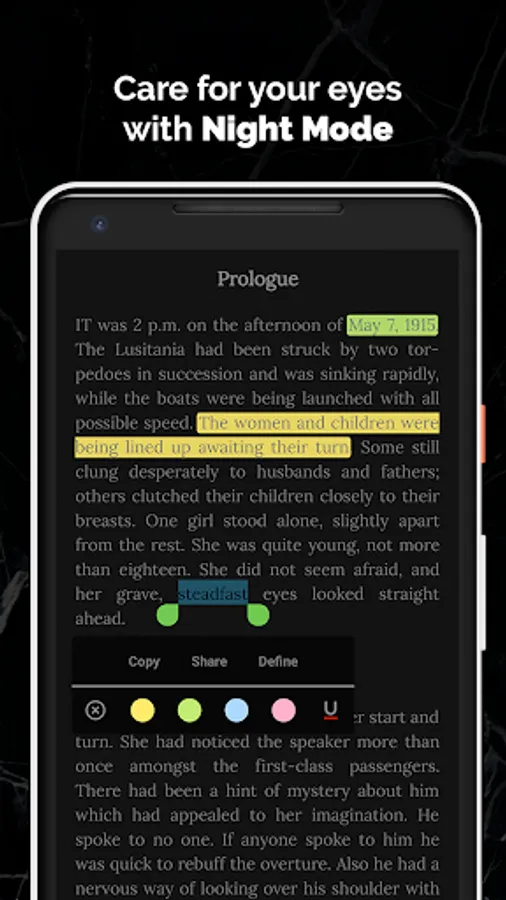 Book reader have night mode function to protect your eyes when read at night. Turn night mode to protect your eyes. Dark theme of the app and the ability to customize the font size does not strain your eyes.