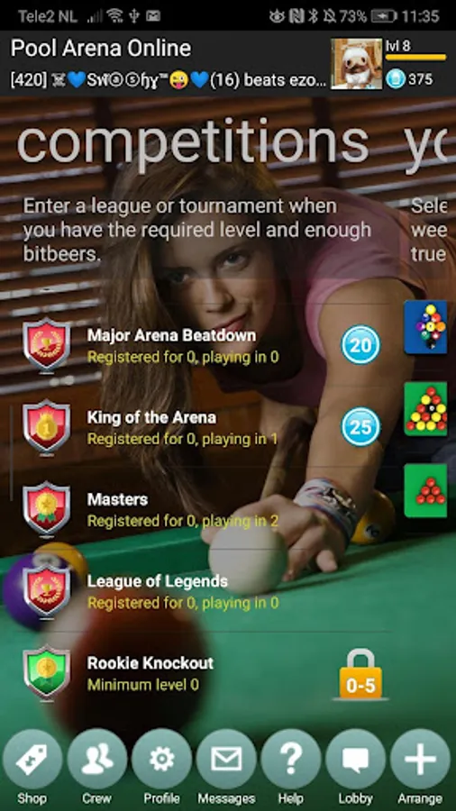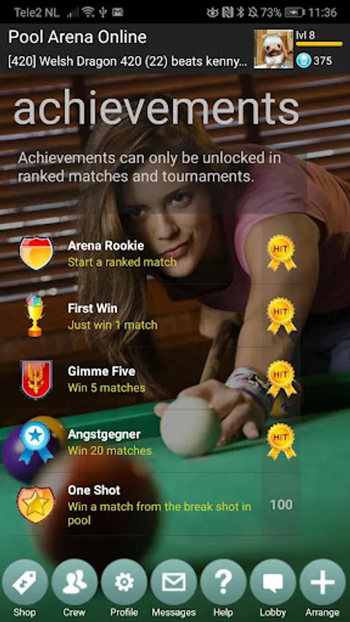 Play 9-ball, 8-ball and snooker matches against opponents all over the world. Climb the rankings, play tournaments and unlock achievements. Chat with your opponents during a match and when you don't feel like playing you can hang around the lobby. Link your devices to play with same account on all!