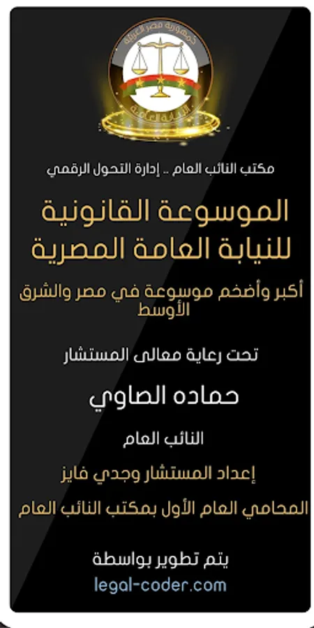* The Legal Encyclopedia of the Egyptian Public Prosecution * - Based on the vision of His Excellency the Attorney General of the Arab Republic of Egypt, Counselor Hamada El-Sawy, that the Egyptian Public Prosecution must accompany the latest digital technologies, and because of his belief that the Public Prosecution has a lofty message whose essence is the truth and its aim to achieve justice, and that it can only be achieved by men who knew the truth and spent it with it. In an effort to expand the application of the digital transformation policy, he ordered his sovereignty to provide an electronic legal encyclopedia for all members of the Public Prosecution Office to refrain from reading the facts and fortify them with knowledge in order to perform the trust entrusted to them. - In the context of the Egyptian Public Prosecution’s relentless direction of digital transformation, the first version - 2020 - comes to applying the Encyclopedia of the Egyptian Public Prosecution - prepared with the knowledge of the counselor and my grandfather - to mobile and tablet devices to support many features and technical and smart services as it provides the most important and largest legal information both in the field of legislation Or the rulings of the various courts, the Public Prosecution Encyclopedia, or the practical encyclopedia, in addition to supporting the latest and most powerful smart search engine to facilitate access to accurate legal information in the simplest, easiest and fastest way. - The Egyptian Public Prosecution affirms its insistence on progress and that it affects society positively through the application of the law and the establishment of values and constructive principles for the nation’s elevation.