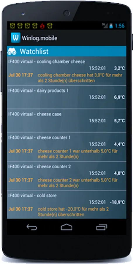 This app enables the user to access Winlog.web remotely via a mobile device. The current measurement values can be checked in watch lists. The app will show alarm messages where required and can indicate those with a ring tone and/or vibration alarm. It enables the user to forward those messages to the contacts stored on the mobile device.