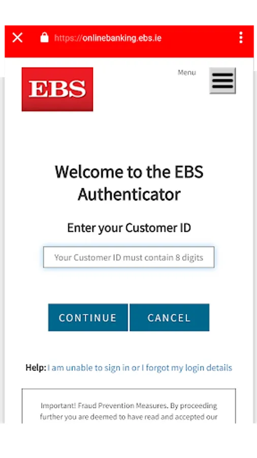 2. Open the EBS Authenticator app. You will be prompted on screen to enter your Customer ID number and Personal Access Code (PAC) as normal, followed by the 6-digit one time activation code which we send to you by post.
