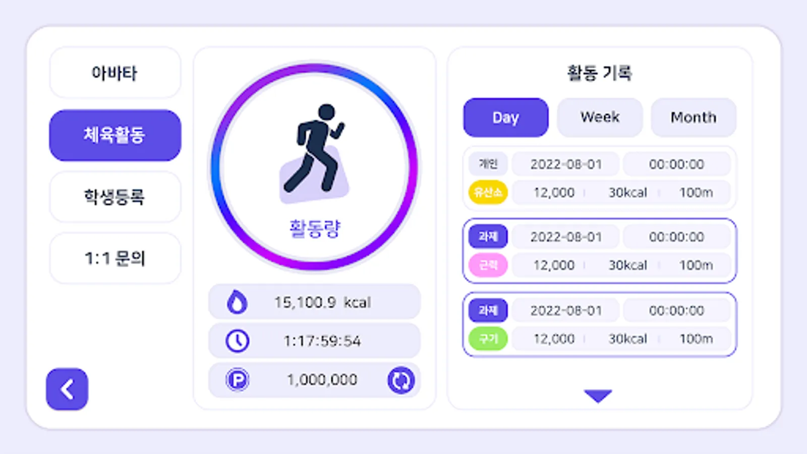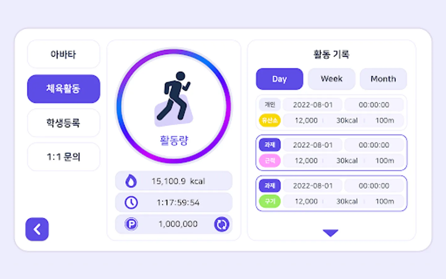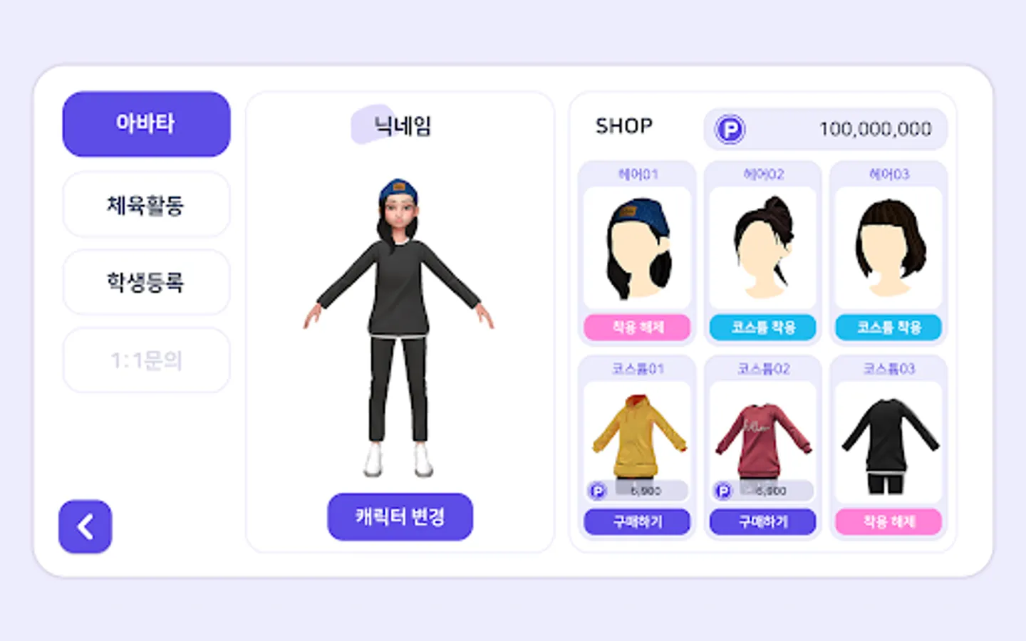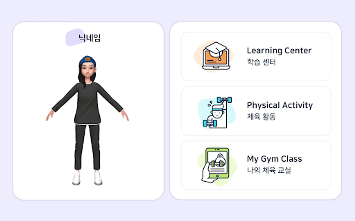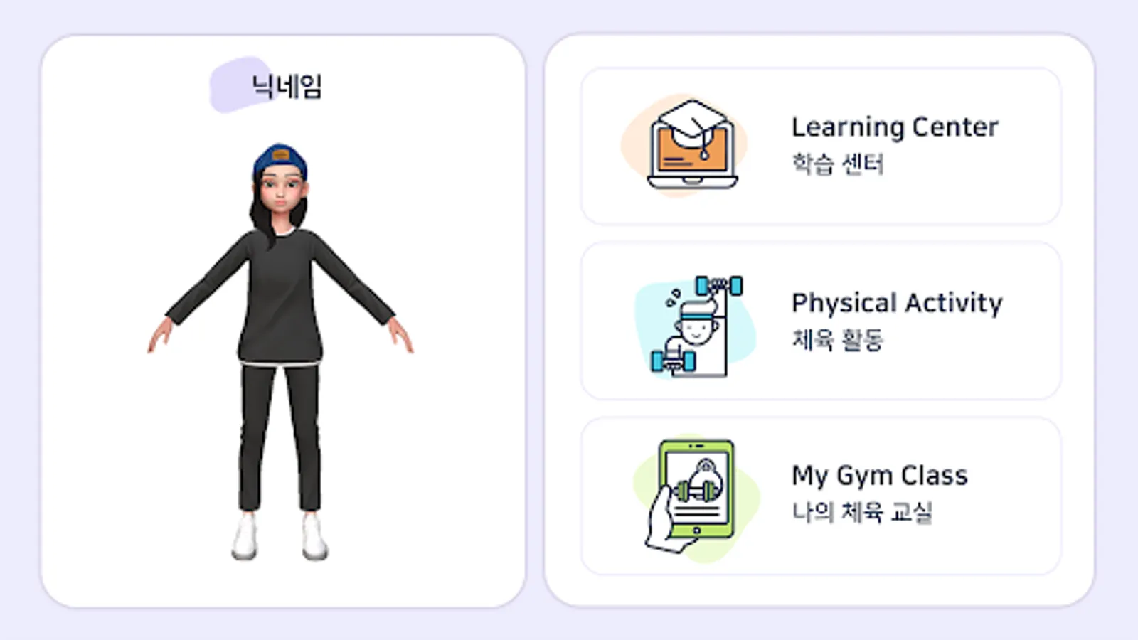 Students can measure their aerobic exercise records using the aerobic exercise monitor provided by the app, and learn 5 types of strength exercises from an artificial intelligence-based AI exercise coach. The result of the physical activity is converted into game money so that the student's avatar can be upgraded. Teachers can direct student physical activity and monitor student achievement through the Learning Center menu.