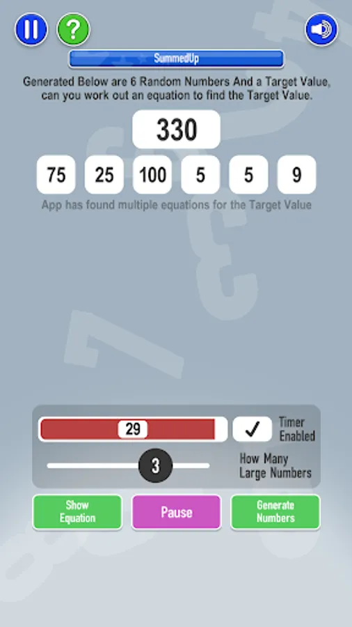 ‘Summed Up’ will give you a target value and a set of 5 numbers ( small and large numbers which can be modified in the settings on the page ). You will then have 30 seconds to try and figure out how to get to the target value using the numbers you have. If you cannot do it then you can click on the ‘Show Equation’ button, the app will show you have to work it out or get as close as you can. You can also click on the 3 lines to show other equations that can be use.