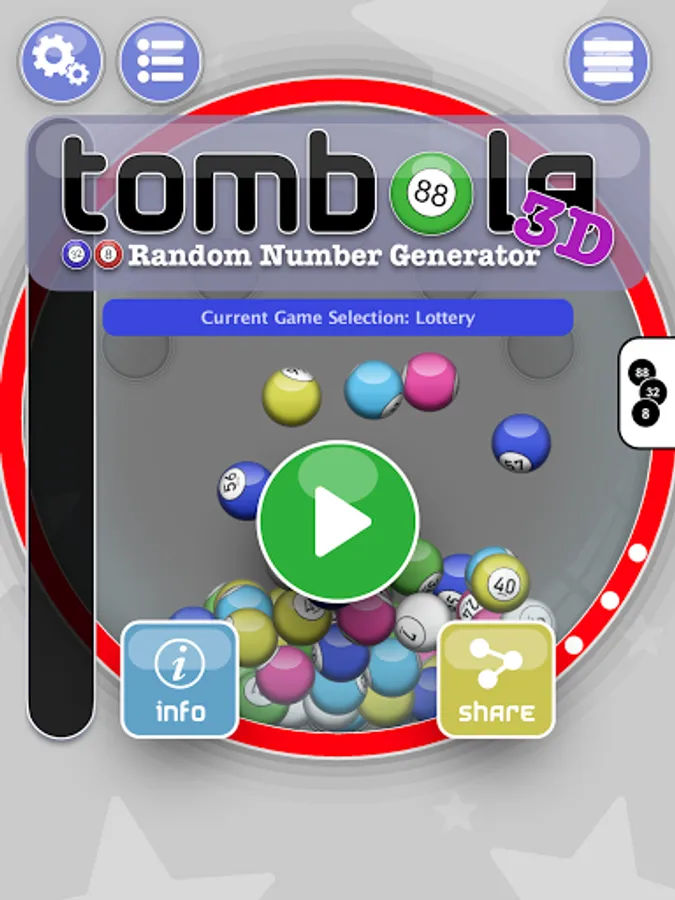 It can be used for Tombola, Lottery, Lotto, Keno and many other applications that you may require a random number generator for, or just simply for fun.