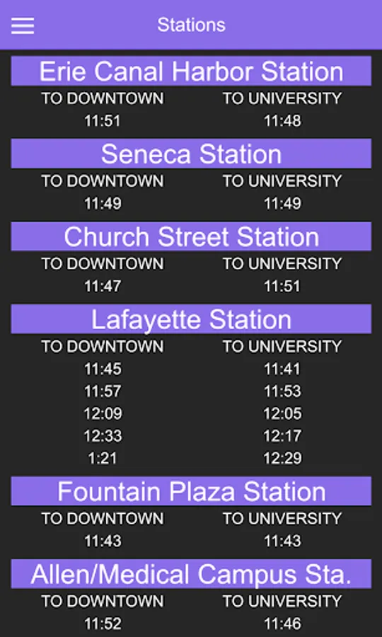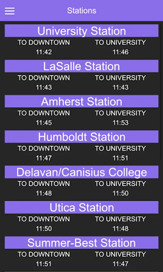 A guide to the train times for the Buffalo Metro Rail. Additionally a map of the full route.