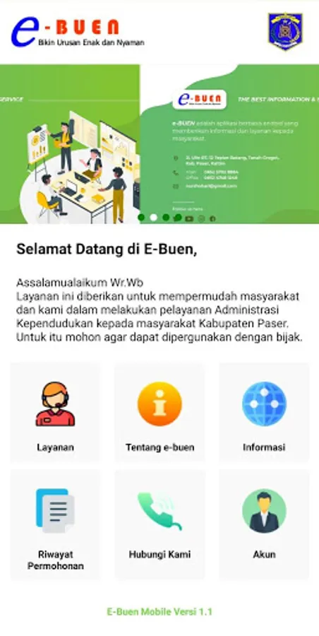 The e-BUEN application (Make Affairs Nice and Comfortable) is an android-based application to provide 13 population administration services to the people of Paser Regency online and in real time. You can easily receive population administration services from your smart phone without having to come to the Paser Regency Population and Civil Registration Office, you can choose the method of submitting the requested documents by delivery, collection, or printing yourself. Thus we want to realize our commitment to provide services that make the community happy.