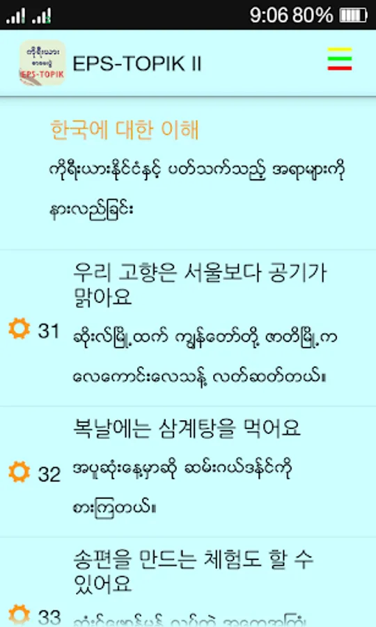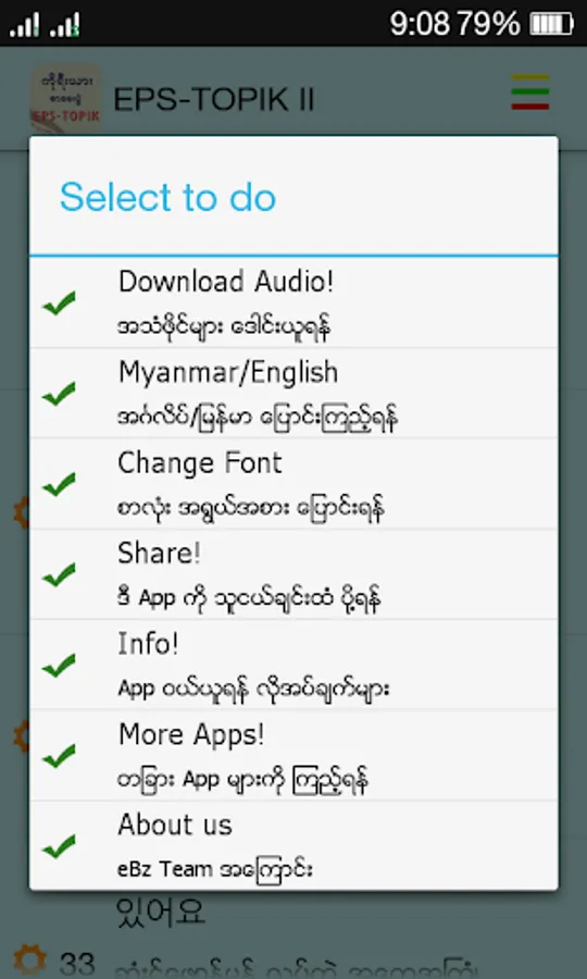 ဒီ EPS-ToPIK II တွင် အခန်း ၃၁ မှ ၆၀ ထိ ထည့်သွင်းပေးထားပါတယ်။ အခန်း ၃၁ တစ်ခုသာ Free လေ့လာ မှတ်သားနိုင်မှာ ဖြစ်ပြီး ကျန်ရှိသည့် အခန်းများ အားလုံးကို လေ့လာလိုပါက ၅၀၀၀ ကျပ်ဖြင့် ဝယ်ယူအားပေးနိုင်ပါတယ်။ ဝယ်ယူရန် လမ်းညွှန်ကို App ထဲတွင် ကြည့်ရှုနိုင်ပါတယ်။