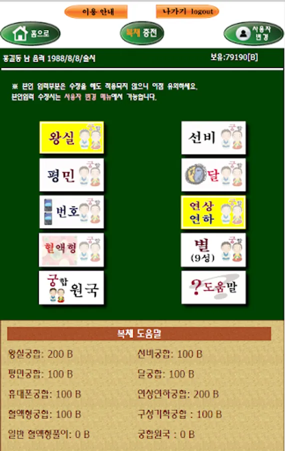 - Premium compatibility - compatibility with royal family, compatibility with scholars, compatibility with common people, compatibility with older children, compatibility with stars, compatibility with moon, compatibility with blood type, compatibility with mobile phones