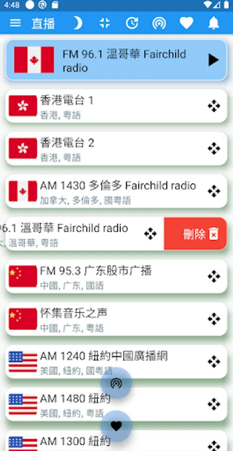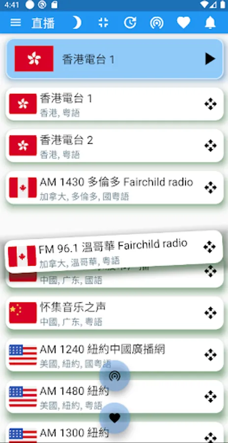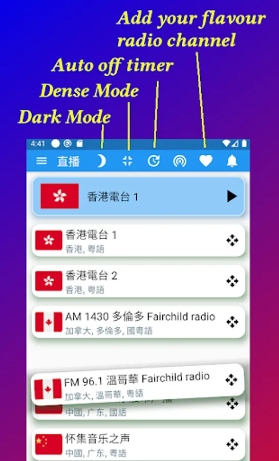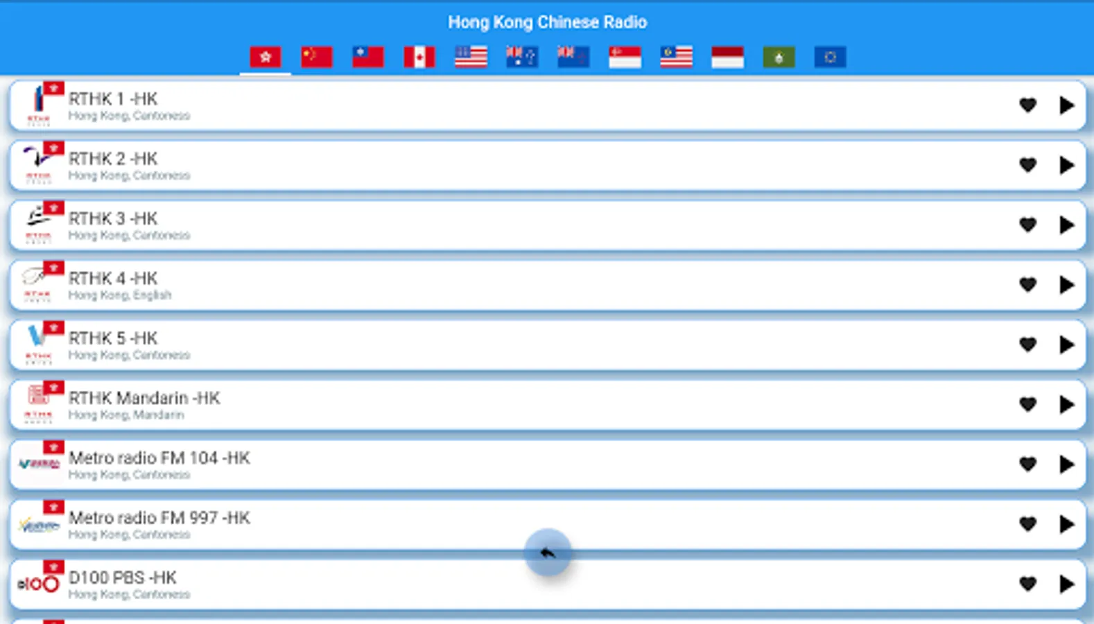 Most popular Chinese radio stations from Canada and other countries (including - Hong Kong / Macau / China / USA / Australia / New Zealand / Singapore / Malaysia / Indonesia), allowing you to quickly switch to all your favorite with a single click Radio station. It has audio buffering and fast switching for a pleasant listening experience.