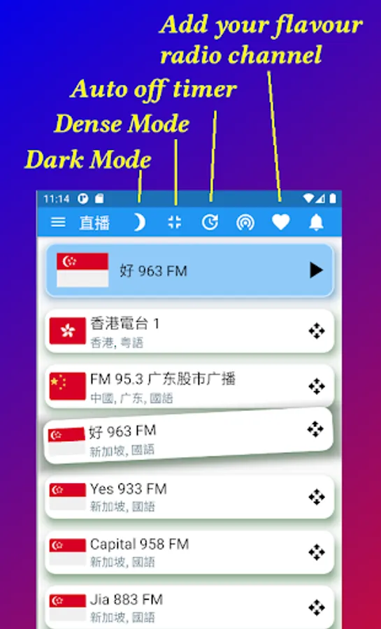 Most popular radio stations from Singapore and other countries (including - Hong Kong / Macau / China / USA / Canada / Australia / New Zealand / Malaysia / Indonesia), allowing you to quickly switch to all your favorite with a single click Radio station. It has audio buffering and fast switching for a pleasant listening experience.