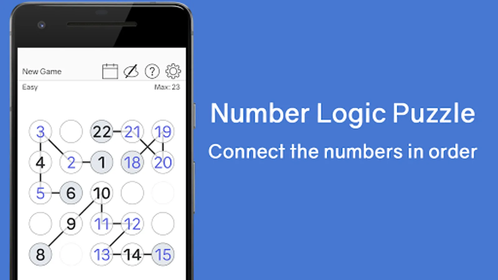 Number Chain is a free number connection puzzle game that connects numbers and completes the chain from 1 to the maximum number. Make a number link and beat your high score in a number puzzle! Test your IQ and enjoy this number puzzle game!