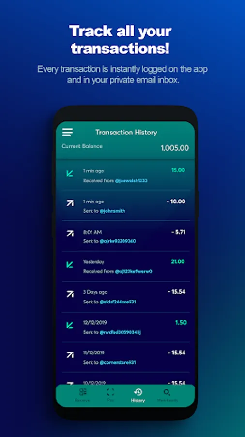 Scan to pay or get paid without touching another person or foreign object. Every transaction is logged in the app and in your private email.