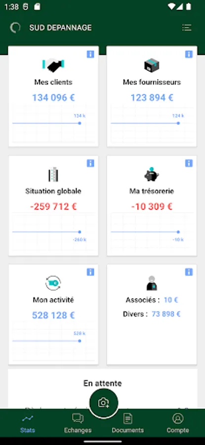 Access your instant dashboard: key indicators, customer outstandings and supplier debts, cash flow, etc. Consult your documents (GED) and submit a simple photo of the elements expected by the firm.