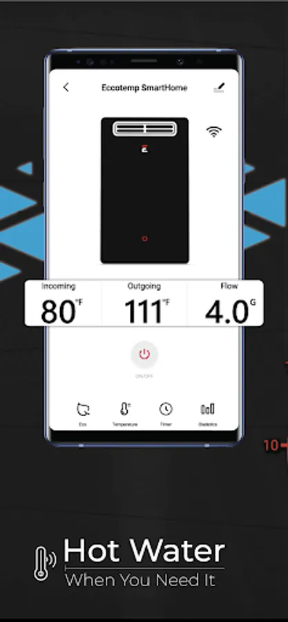 The Eccotemp SMARTHOME app lets you adjust temperature, turn Eccotemp water heaters on/off, and view usage statistics. You can also connect Eccotemp water heaters to a compatible smart device to use voice commands.