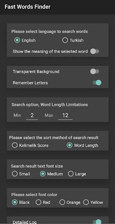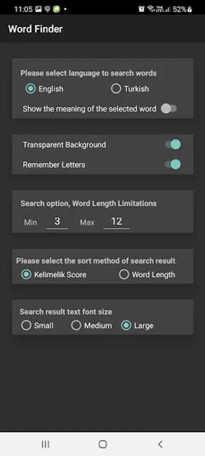 It is a fast dictionary search application for word games. With the help of local dictionary you may find the best possible words from given letters. When you turn on the app transparent background feature, you may easily see the board and your rack. It is helper app for games like Kelimelik, WWF, Scrabble GO, Kelime Avi and Wordle