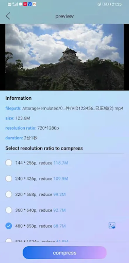 2、Choose the resolution you want to compress, here you can see the storage that can be reduced.