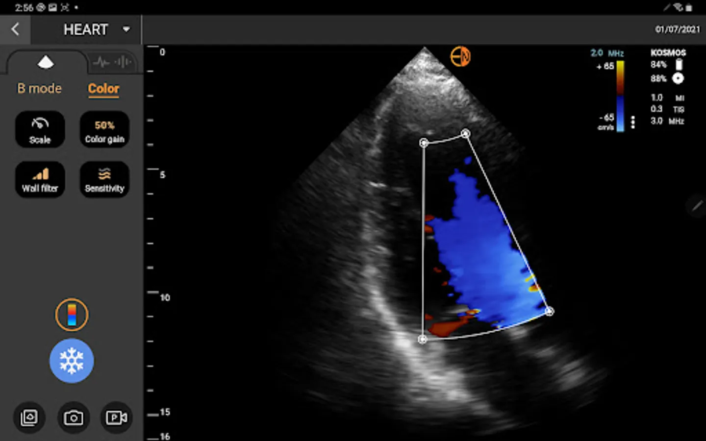 Kosmos brings the capabilities of powerful high-end cart systems and engineering to a sophisticated handheld mobile solution to support point-of-care physicians with diagnostic quality images. AI features include AI FAST, Auto EF and AI Trio Guidance, Grading, Labeling of optimal imaging planes. Imaging features include 2D imaging enhanced with PW, TDI, and CW doppler capabilities, with highly sensitive Color and Power Doppler functions.
