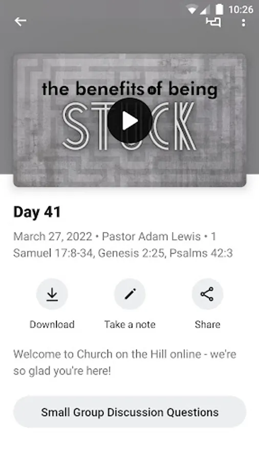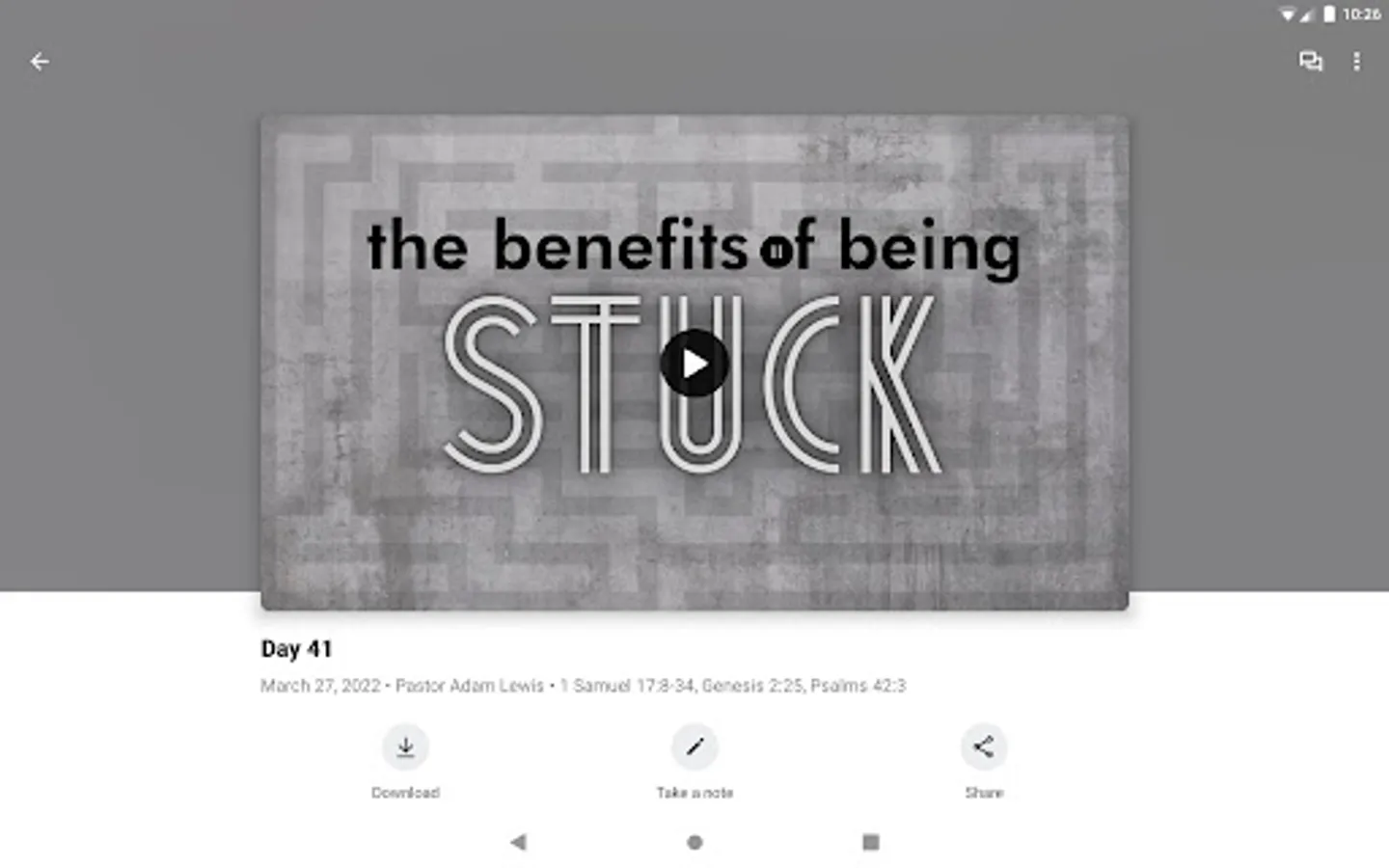 This app will help you stay connected with the day-to-day life of our church. With this app you can: watch or listen to past messages; stay up to date with push notifications; share your favorite messages via Twitter, Facebook, or email; and download messages for offline listening.