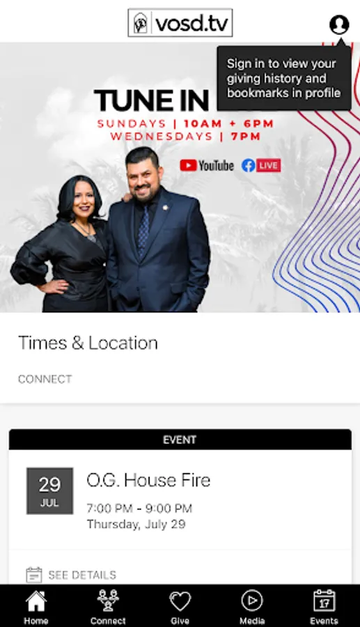 Connect and engage with the VOSD app! You will be able to view upcoming events, give, read the bible, and more!