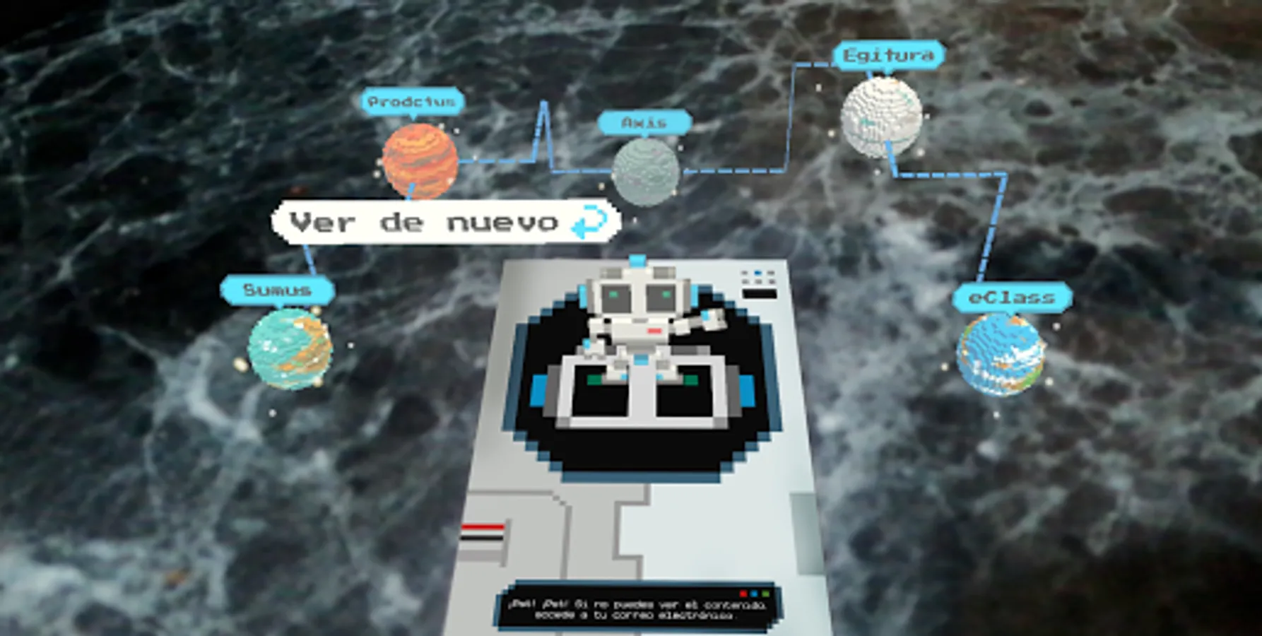 Tour the galaxy and discover the map of this little induction space adventure. eClass Journey is an augmented reality experience for smartphones, in which you will meet BePlat, a nice robot that will show you the route to follow. Explore the map and know the characteristics of the planets that you will visit heading to our space base.